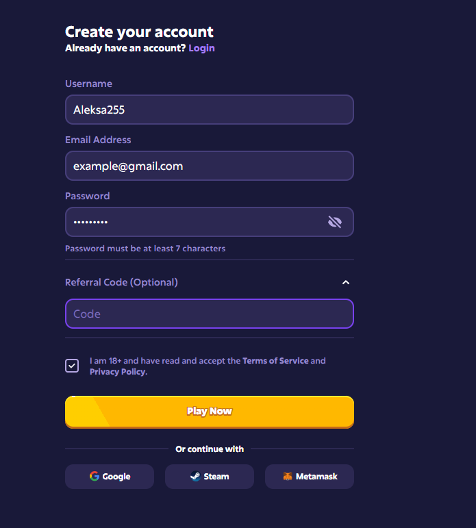 Create a new Roobet account through the sign-up page. Simply click on the Register button at the top right part of the screen.