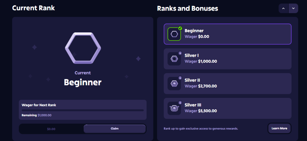 These rewards are activity-based, not tied to a single deposit, and they are credited over time as you play. Any wagering requirements apply at a high level through normal gameplay rather than fixed rollover targets, which makes the system more flexible than standard one-time bonuses.