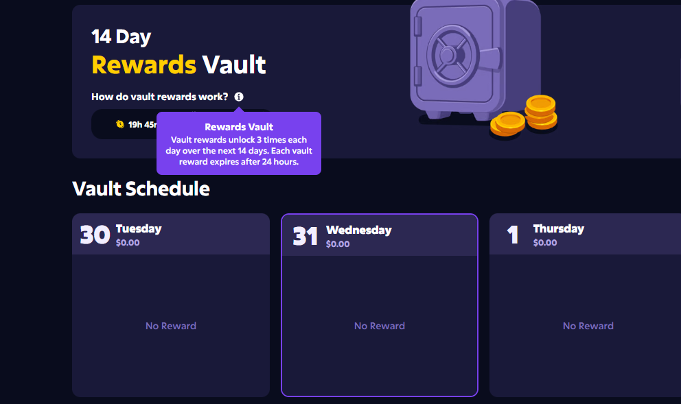 RooWards runs on multiple layers. You earn Instant Rakeback every 30 minutes based on wagers, plus daily, weekly, and monthly bonuses that unlock over time. Part of each reward is paid instantly, while the rest is stored in the Vault, which can be claimed several times per day.