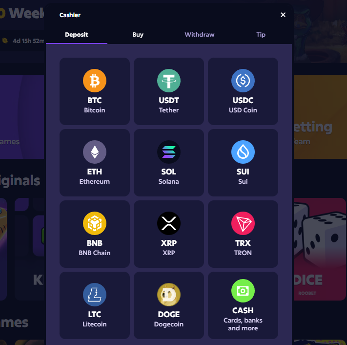 Roobet supports both cryptocurrency and traditional payment methods, with crypto being the main option for most users. And it doesn’t matter if you’re using a Roobet promo code today, a Roobet referral code, or any Roobet bonus code, payments work the same once your account is set up.