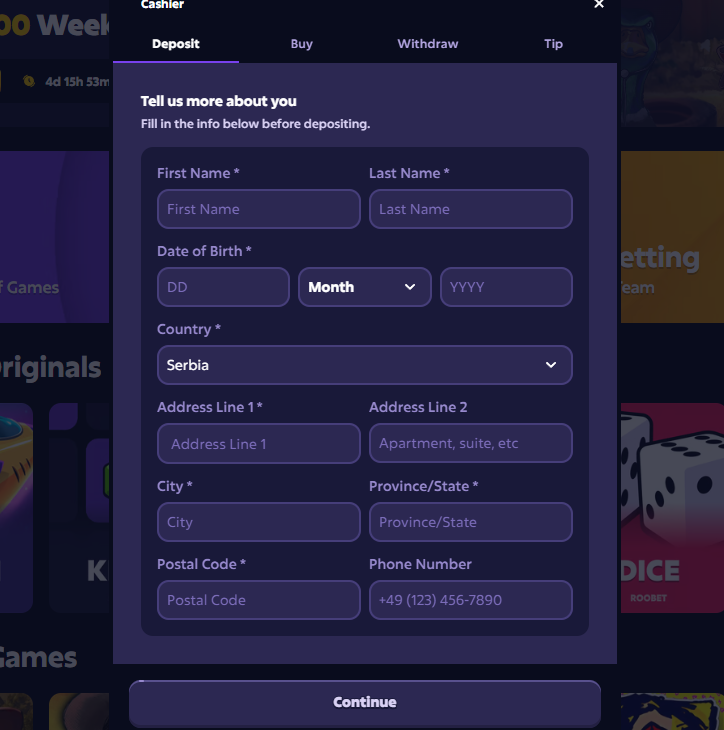 Before depositing, players are asked to provide basic personal details. This is standard and helps ensure smooth withdrawals later, especially when using a promo code for Roobet that unlocks ongoing rewards.